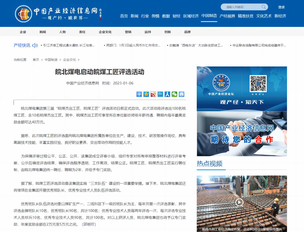 1月6日中國產業經濟信息網:皖北煤電啟動皖煤工匠評選活動