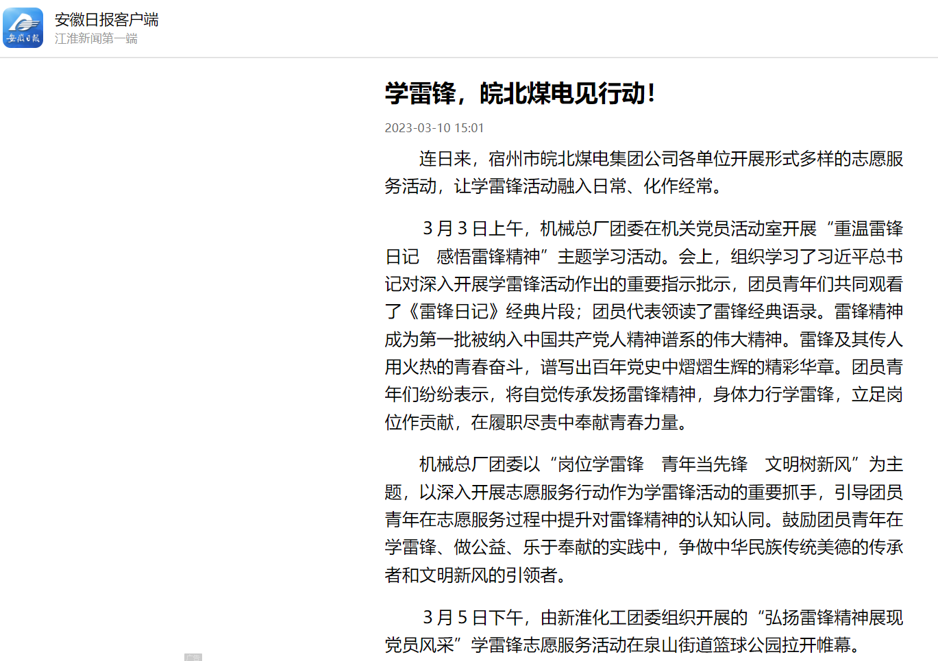 3月10日安徽日報客戶端:學(xué)雷鋒 ,皖北煤電見行動