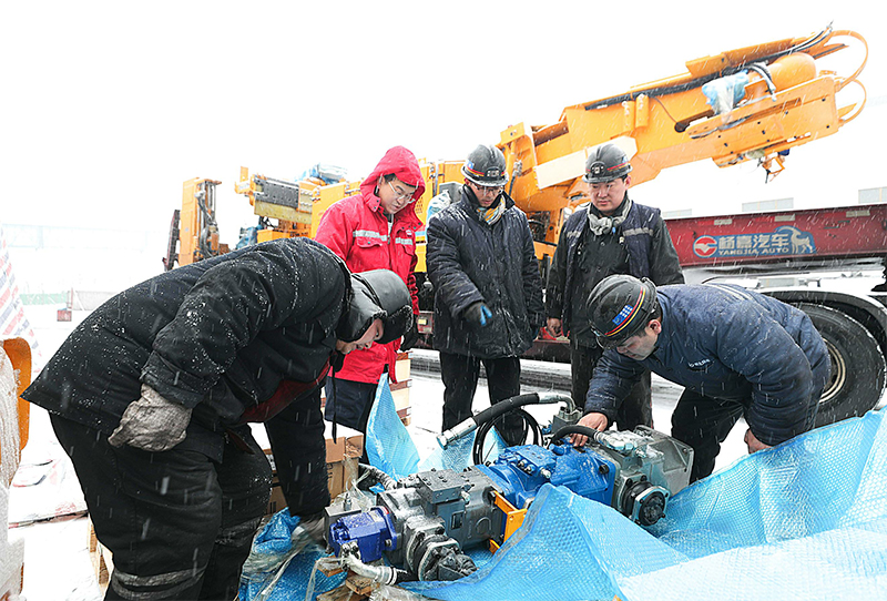 圖片說明:麻地梁煤礦掘進區(qū)第二套掘錨成套裝備裝備頂風(fēng)冒雪進場,組織精干人員開展設(shè)備組裝工作。