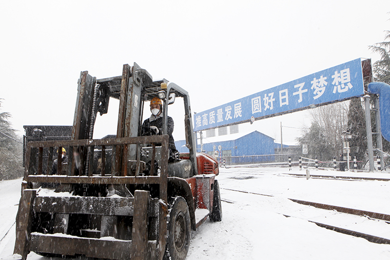 圖一:皖北煤電集團恒源煤礦生產(chǎn)準(zhǔn)備區(qū)職工正駕駛叉車冒雪來回運輸物資、材料。