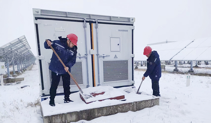 光伏電站工作人員及時清理逆變器周邊積雪,保障設(shè)備安全運轉(zhuǎn)。