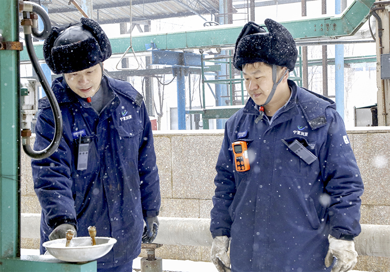 圖片說明:2月3日,寧夏中衛(wèi)市迎來了強降雪天氣,天寒地凍、白雪飛舞,寧夏潤夏能源化工公司濃硝酸車間三組現(xiàn)場巡檢人員在裝置現(xiàn)場檢查重大危險源硝酸罐區(qū)洗眼器出水是否正常。